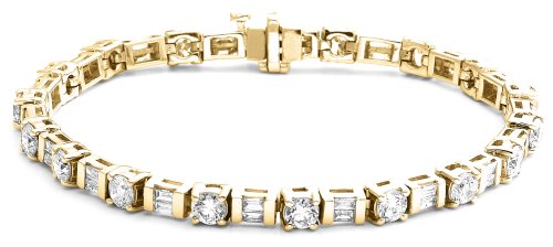 Choose a look of simple luxury with this stunning diamond tennis bracelet, offered in your choice of 14 karat white or yellow gold. It showcases a slender line of sparkling round and double baguette diamonds, arranged in an alternating pattern in prong and channel settings. There are 18 round and 36 baguette diamonds altogether, for a total diamond weight of 5 1/2 carats. The mix of diamond shapes