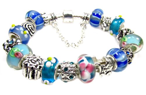 Buy Now Shades of Blue High-quality Charm Bracelet with 18 Beads - Opens so Beads CAN Be Changed. Beautiful Pandora-compatible Bracelet Complete with Murano Beads and Charms. Fits 6 Inches and Up.